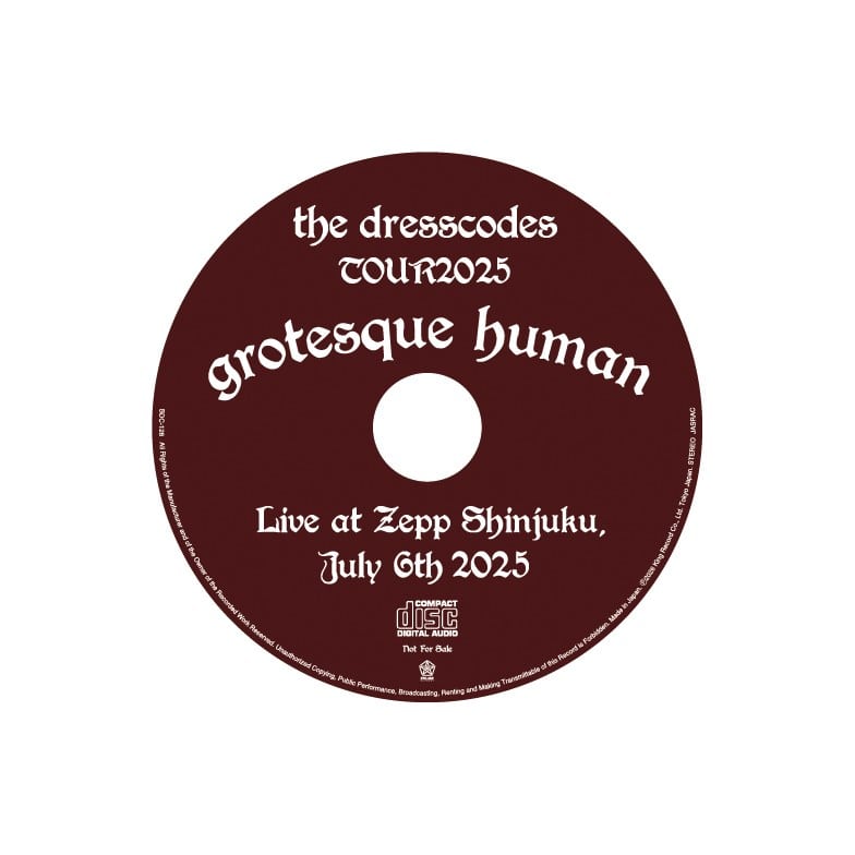 【収録内容】※Blu-ray/DVD共通 「the dresscodes TOUR 2025“grotesque human"」LIVE本編映像 2025.7.6 Zepp Shinjuku(TOKYO) 01. ヴィシャス 02. うつくしさ 03. リンチ 04. 人間不信 05. この悪魔め 06. 聖者 07. がっかりすぎるわ 08. 悲しい男 09. ロックンロール・ベイビーナウ 10. REBEL SONG 11. コミック・ジェネレイション 12. ビューティフル 13. シスターマン 14. ミスフィッツ 15. 愛に気をつけてね